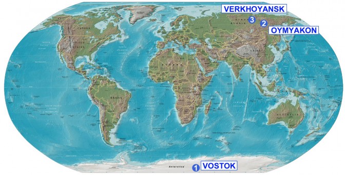 Oymyakon detém o recorde de ser o lugar permanentemente habitado mais frio da Terra. A vila, que fica 350 quilômetros abaixo do Círculo Polar Ártico, é o lar de mais de 210.000 pessoas, apesar de seu solo estar em um estado constante de permafrost. A escola de Oymyakon só fecha quando a temperatura cai abaixo de menos 52°C, e os moradores deixam seus veículos rodando durante todo o dia para conseguirem dirigi-los. As cidades de Verkhoyansk, Yakutsk e Oymyakon ficam em uma região que antigamente era apelidada de “Anel da morte de Stalin”, já que era um dos destinos para os exilados políticos do regime soviético.